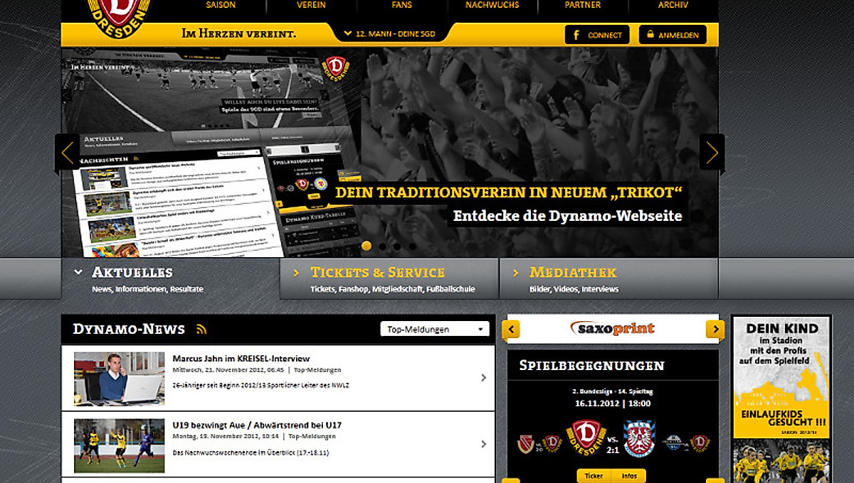 Zum ersten Mal in ihrer Geschichte hat die SG Dynamo Dresden in der Nacht zum Donnerstag einen umfassenden vereinseigenen Webauftritt gestartet. Damit ist die Zeit der Übergangshomepage, die im Sommer 2011 binnen kürzester Zeit aus dem Boden gestampft werden musste, endlich vorbei. An dieser Stelle bedanken sich die Verantwortlichen der SGD ausdrücklich und sehr herzlich bei der Firma Queo, die sich in diesen anderthalb Jahren als zuverlässiger Partner erwiesen hat, der dem Verein sehr unkompliziert mit Herz und Kompetenz zur Seite stand.