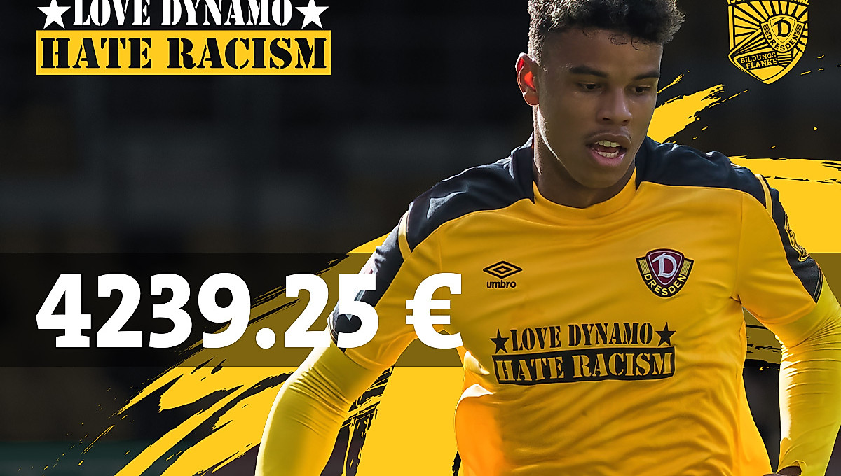 Die Versteigerung der getragenen LDHR-Sondertrikots von Kevin Broll, Heinz Mörschel, Michael Sollbauer, Christoph Daferner und Ransford-Yeboah Königsdörffer aus dem Heimspiel gegen den 1. FC Nürnberg zu Gunsten des guten Zweckes brachte insgesamt 4.239,25 Euro ein.Jürgen Wehlend, Geschäftsführer der SGD, sagt: „Vielen Dank an die gesamte ‚Dynamo-Familie‘, die den Aktionsspieltag ‚LOVE DYNAMO – HATE RACISM‘ am vergangenen Sonntag einmal mehr mit größter Überzeugung und voller Hingabe weit über unsere Heimatregion hinaus transportiert hat. Die Sportgemeinschaft hat zum elften Mal in Folge bundesweit das Zeichen gesetzt, dass sie gemeinsam für Vielfalt steht und entschieden gegen Rassismus eintritt. Um für dieses gesellschaftlich relevante Thema auch nachhaltig zu sensibilisieren, werden die aus der Trikot-Auktion erlösten Gelder sozialpädagogischen Projekten zur Verfügung gestellt, die sich insbesondere für eine Anti-Rassismus-Arbeit einsetzen.“