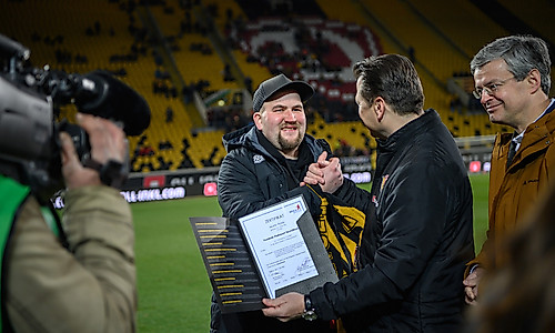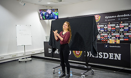 Eine ganz besondere Aktion gab es auch für alle gehörlosen Fans der SGD, denn das Stadionprogramm sowie die Hymne wurden von einer Gebärdensprachdolmetscherin auf die Leinwand übertragen. Auch das Blindenradio freute mich über einen besonderen Gast: Patrick Wiegers, ehemaliger Dynamo-Keeper, war als Co-Kommentator zu Besuch.