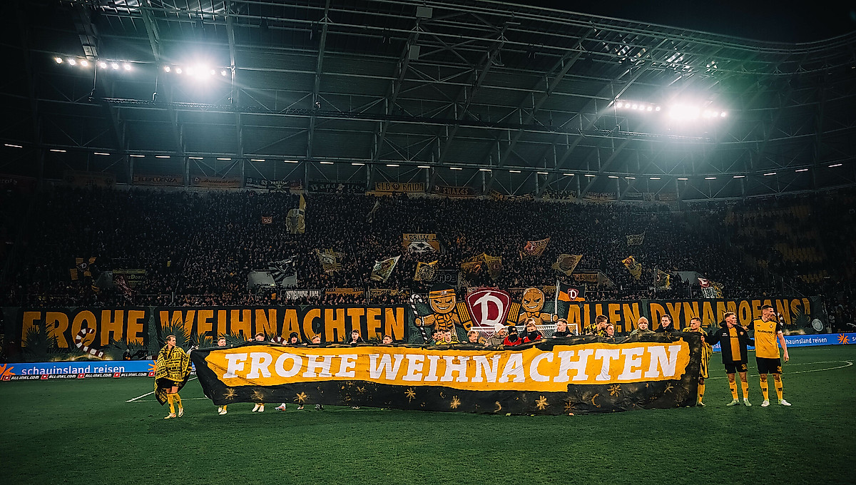 Noch am selben Wochenende kürten sich die Frauen der SGD zum Herbstmeister. Mit einer maximalen Punkteausbeute, acht Siegen aus acht Spielen sowie 69 geschossenen Toren gingen sie basierend auf beeindruckenden Leistungen als Tabellenerster in die Winterpause. Für die erste Herrenmannschaft standen nun Spitzenspielwochen auf dem Plan. Zunächst konnte man dank David Kubattas Jokertor ein 1:1 gegen Saarbrücken erkämpfen. Es folgte eine fulminante Leistung gegen Sandhausen, als man nach langer Durststrecke endlich mit 4:2 am Hardtwald gewinnen konnte. Am 2. Adventswochenende gastierte dann Arminia Bielefeld im RHS und wurde dank einer souveränen Leistung mit 3:0 zurück nach Ostwestfalen geschickt. Erwähnenswert im Zuge dieses Spiels ist auch der zweite Soziale Weihnachtsmarkt, den Fanszene und Verein zugunsten guter Zwecke auf die Beine gestellt hatten. Auch die Wichtelbesuche in sozialen Einrichtungen wie etwa der Dresdner Tafel, bei der Lebenshilfe oder im Uniklinikum zählten in der Weihnachtszeit wieder zum Programm der SGD. Ein hart umkämpfter 2:1-Arbeitssieg über den SV Waldhof Mannheim stellte das Ende des Pflichtspieljahres vor heimischer Kulisse dar. Er bedeutete zugleich, dass die Mannschaft in der Hinrunde der 3. Liga zu Hause ungeschlagen blieb.
